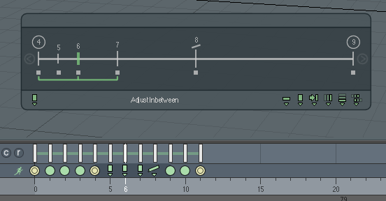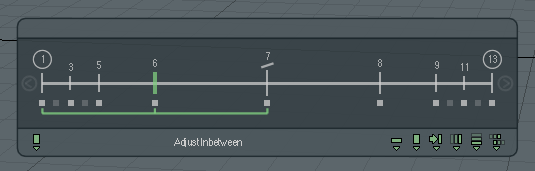 中間の編集は、内訳の編集に似ています。チャートマーカーの下の緑色の括弧は、中間フレームが作成されたフレームを示します。これらはそのポーズのペアですModoを使用して、優先スライダーの位置を調整するとき、またはチャート内でその中間をドラッグした場合に、から補間します。これは中間ツールこれは常に前のキーと次のキーの間を補間します。