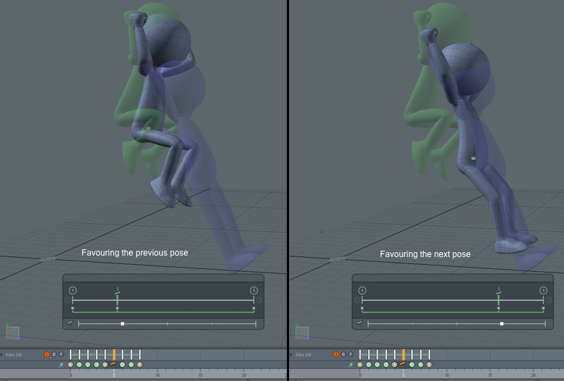 例からわかるように、 Modo数学的に正しい中間ポーズを作成します(ほとんどの場合これは適切です)が、このポーズは2つのポーズ間の単なる線形ブレンドであるため、個性や感覚はありません。アニメータにとって、これはより興味深いポーズを作成するための出発点として役立ちます。
