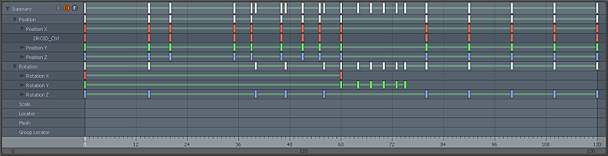 一番上の行の白いキーフレームハンドルは、特定のフレームのすべてのハンドルを調整する便利な方法を提供するマスターキーです。マスターキーを移動すると、その下にあるすべてのキーフレームハンドルが移動します。同様に、たとえば、位置Xのキーを移動すると、関連するマスターキーが位置Xキーフレームとともに自動的に移動します。