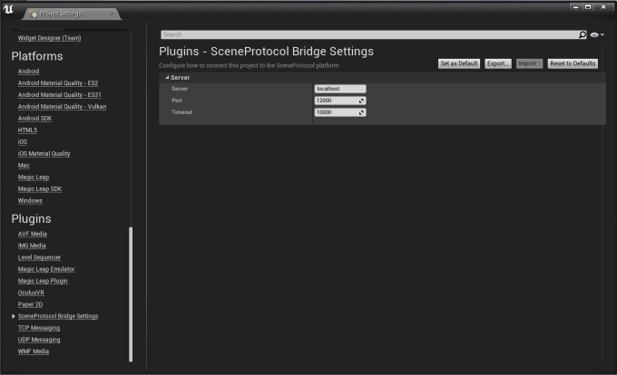 | 4. | 下Plugins、クリックScene Protocol Bridge Settingsと入力しますServer 、 Port 、およびTimeout情報。 |