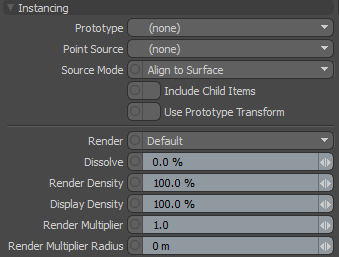 のPrototypeオブジェクトは、ポイントソース上で複製されるメッシュアイテムです。これは、単一のポリゴンや立方体のような単純なものでも、木や高層オフィスビルのような複雑なものでもかまいません。オブジェクトが複数のメッシュアイテムレイヤーで構成されている場合は、アイテムを階層でペアレント化し、 Include Child Itemsトグル。これは、アニメーションアイテムでも機能します。 |