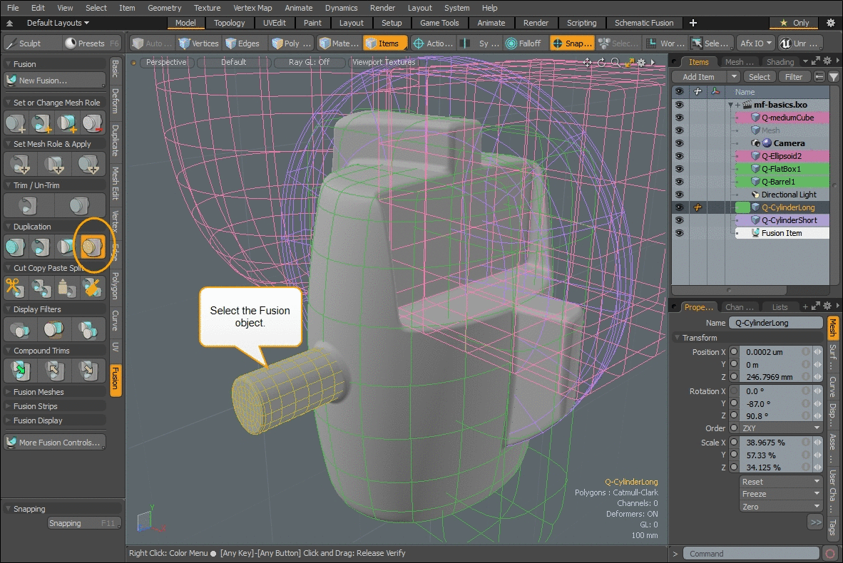 選択したオブジェクトを複製し、Fusion以外のオブジェクトを作成します。メッシュアイテムが作成され、3Dビューポートに表示されます。 Item List。 下の画像をクリックしてアニメーションをご覧ください。 |