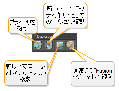 Fusionアイテムの複製を作成するには、シーンでFusionアイテムを選択し、Duplicate Fusionツールの1つをクリックします。