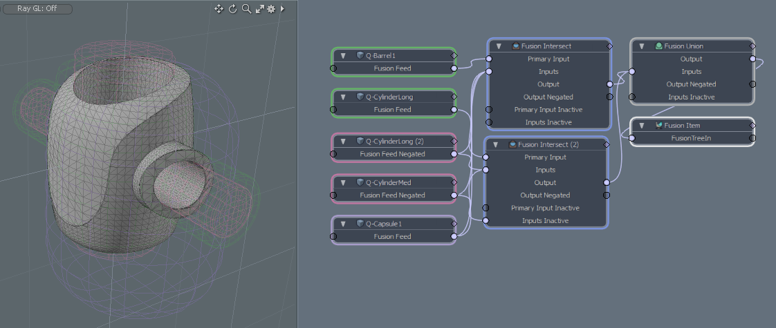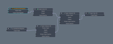 通常、 Fusion Feedメッシュから出力し、それをブール演算子の適切な入力に配線します。メッシュを準備することを忘れないでくださいFusion Feed出力。ノードグラフのさまざまなブランチは、 Fusion Intersectブランチを結合するノード。その後、フローはFusion Item。
