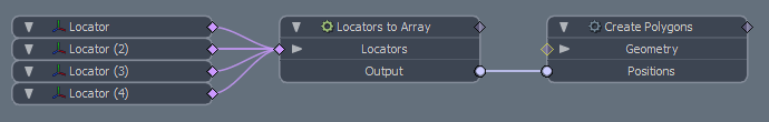 | 2. | アレイをCreate PolygonsノードのPositionsチャネル。ここでは、 Outputロケーターから配列への操作は、 Positionsポリゴンの作成操作用。 |