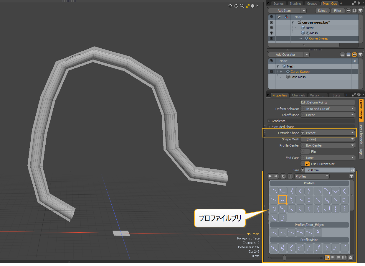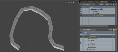 Curve Sweepメッシュ操作がMesh Operationsリストに追加されます。そして、そのプロパティが右下のパネルで開きます。