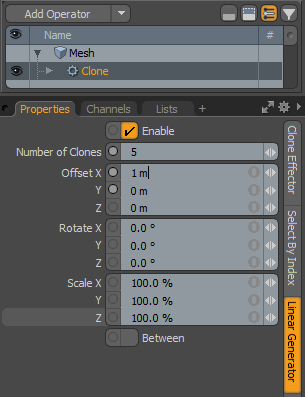 | 8. | 右側のパネルで、 Linear GeneratorタブとセットNumber of Clonesに5、およびOffset Xに1m。 |