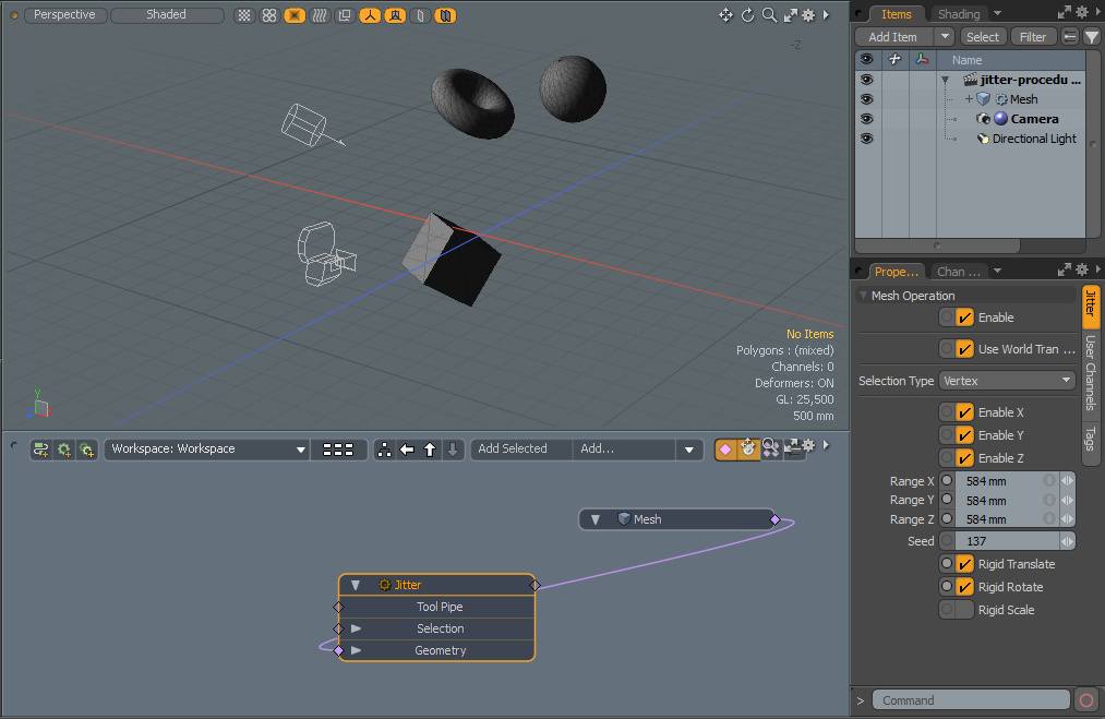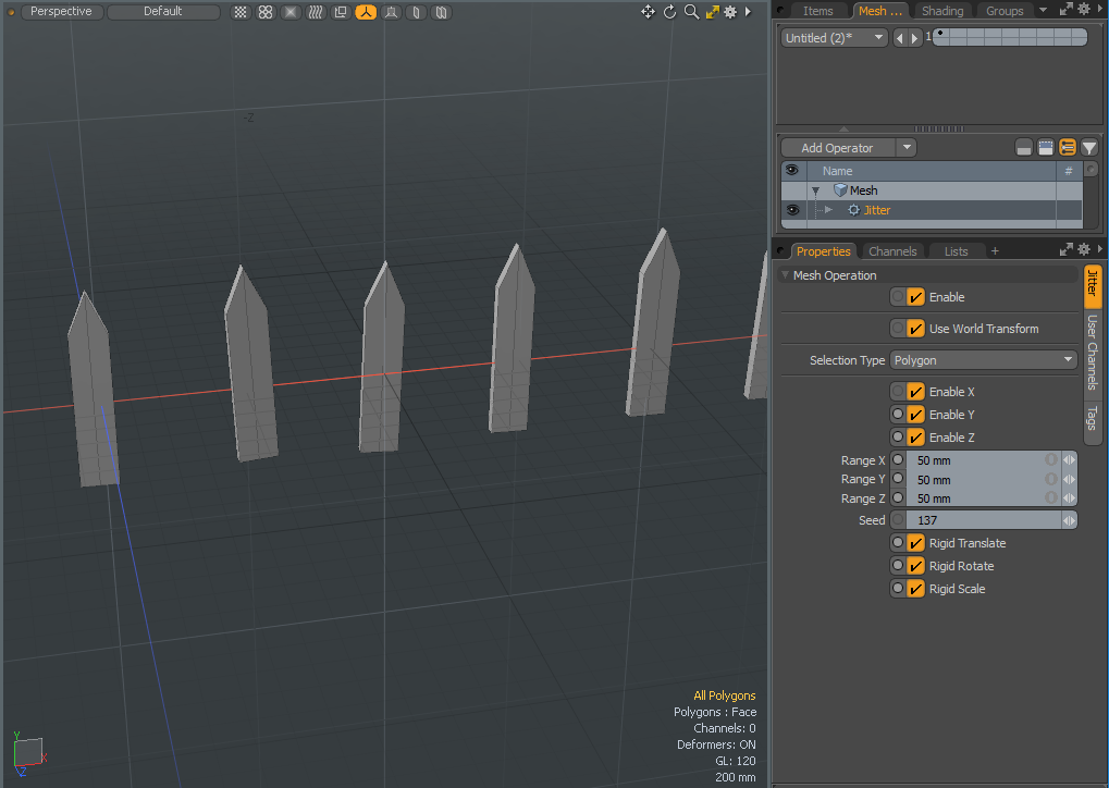 | 9. | 右側のパネルで、一番上のメッシュアイテムを選択し、 Add Operator、ダブルクリックしますMesh Operations > Deform > Jitter。 |
