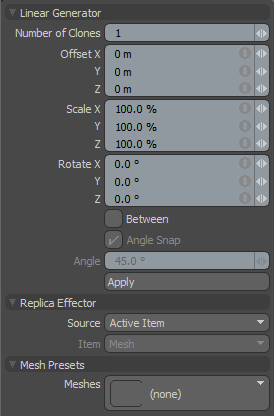 クローンは、手続き型メッシュ操作としても使用できます。これは、クローンエフェクターとリニアジェネレーターサブツールの組み合わせです。