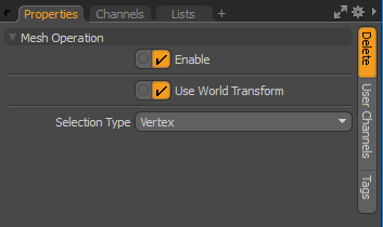 で作業するときModoの手続き型モデリングツールでは、手続き型のDelete頂点、ポリゴン、またはエッジを削除する操作。でアイテムを選択しますMesh Opsシーンから削除するリストをクリックして、 Add Operator > Edit >Deleteプロパティを指定します。その結果、選択した頂点、エッジ、またはポリゴンのみがシーンに表示されます。