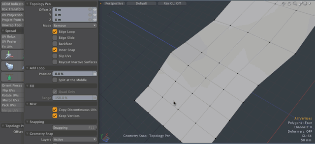 形状の再ポポロジー化プロセスに直接関連するいくつかのモードを提供します。 • Move -要素をドラッグしながら移動しますが、スライドするため、要素は背景サーフェスに対して固定されたままになります。これは、頂点、エッジ、ポリゴンの編集に役立ちます。 • Duplicate -ドラッグするとエッジが複製されます。とEdge Loop有効にするか、マウスの右ボタンでドラッグすると、エッジループ全体を同時に複製できます。このモードでは、個々の頂点を複製して三角形のポリゴンを作成します。 • Remove -要素をジオメトリから完全に削除します。このモードでは、個々の外側のエッジは変更されませんが、内側のエッジ、頂点、およびポリゴン全体が削除されます。マウスの右ボタンを使用すると、ループ全体が削除されます。 • Split -エッジを作成し、頂点をドラッグするときに、ドラッグして隣接する頂点にスナップできます。これにより、ジオメトリが新しいエッジで分割されます。 • Add Loop -別のエッジまたは三角形に遭遇するまで、ジオメトリのスパン全体またはループ全体に新しいエッジを作成します。インタラクティブにドラッグすると、ループの位置が調整されます— Split at the Middle有効。 • Point -マウスをクリックし、ポインターが空の領域にある場合、1点ポリゴンを描画します。このモードでジオメトリコンポーネントをクリックすると、ツールはMoveモード。 • Fill -近くのエッジとポイント(頂点)を探し、それらから四角形または三角形のポリゴンを自動的に生成しようとします。このモードを使用して、頂点の配置に使用されるポイントモードを使用した後、ポリゴンのグリッドで広い領域を塗りつぶすことができます。頂点を配置した後、塗りつぶしモードに切り替え、ジオメトリを作成するために各四角形(または三角形)ポリゴンが表示される場所の中央をクリックします。Modoプレハイライトクリックすると作成されるジオメトリを示すポリゴン。 • Smoothing -フォールオフ範囲内の要素をクリックしてドラッグすることにより、頂点を緩和します。このモードを使用すると、メッシュのトポロジをクリーンアップして、背景に拘束しながら、サーフェス上の頂点間の間隔を均等にすることができます。いつEdge Loopを有効にすると、エッジループの頂点がカーブに沿ってリラックスします。もしRadiusフォールオフの値がゼロの場合、すべての頂点の位置が緩和されます。Strengthモデルに適用されるスムージングの量を制御します。Iterationsその回数を決定しますModoスムージングを適用します。両方の組み合わせStrengthそしてIterationsモデル全体の平滑化を制御します。 |