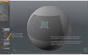 トポロジペンツールにはスムージング機能があり、サーフェス上の頂点間の間隔を均一にしてトポロジをクリーンアップできます。メッシュのセクションにスムーズな操作を集中できます。ドラッグすると、現在の場所の周りのポイント/エッジが強調表示され、フォールオフの半径が示され、選択したポリゴンがリラックスして均一な分布になります。