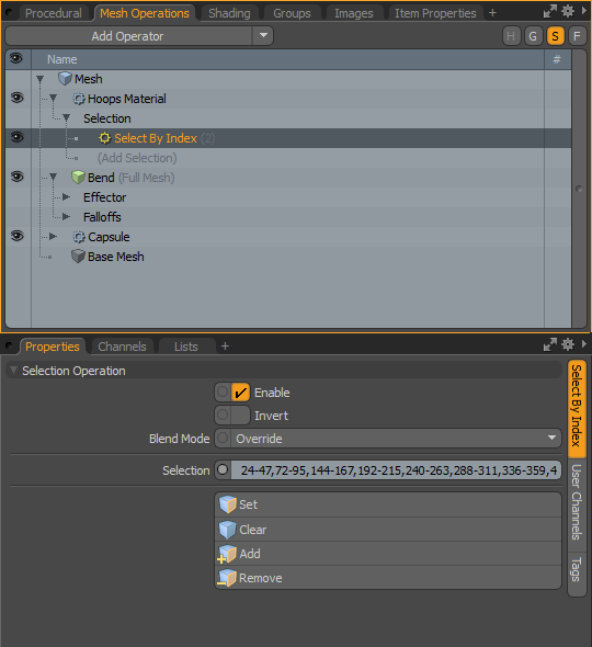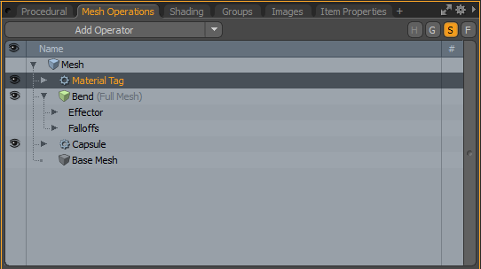 手続き型モデリングでは、ジオメトリと操作をメッシュ操作リスト。アイテムは、上のアイテムが下のアイテムに影響するように階層化されています。これにより、スタック内のレイヤーに戻ってその設定を変更できるため、非破壊モデリングにシンプルな構造が提供されます。下の画像はサンプルを示していますリスト。