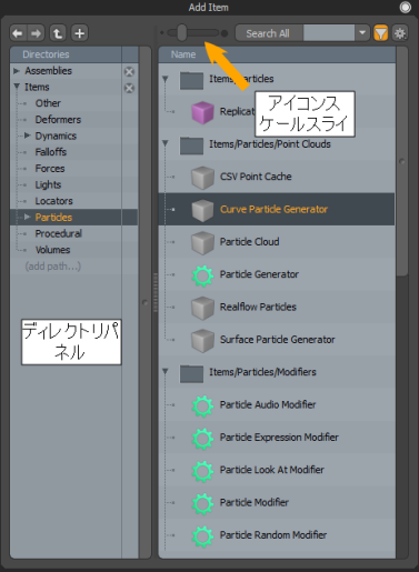 プリセットブラウザは、手続き型モデリングのパレットであり、同等の手続きを持つすべてのツールはここにあります。ツールは、タイプごとにディレクトリごとにグループ化されています。ディレクトリをナビゲートするには、 Directories左側のパネル。スケールスライダーを使用して、アイコンのサイズを変更できます。カテゴリヘッダーにはフォルダアイコンがあり、ツールには個別のアイコンがあります。