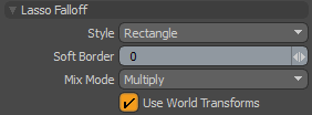 画面スペースに描画されたLassoセレクションのいくつかのスタイルは、無限に向かって外側に突き出ており、非常に特殊な減衰を生み出しています。設定を使用すると、[ソフトボーダー]オプションを使用して、投げ縄形状の周囲の影響範囲を定義できます。なげなわ内のすべての領域は、ツール効果の100%を受け取ります。減衰の減衰は、なげなわ領域の外側の「ソフトボーダー」距離でのみ発生します。