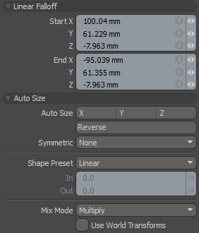 これら3つのオプションのいずれかを選択して、 StartそしてEnd 3つの軸のいずれかに沿って選択した要素の境界ボックスサイズに一致するフォールオフのポイント。 |