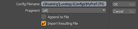 構成ファイルを保存する場所を指定し、ファイルに名前を付けることができます。 デフォルトでは、このファイルは次のディレクトリに保存されます。 ウィンドウズ: C:\Users\'user name'\AppData\Roaming\Luxology\Configs マックOS: /Users/qa/Library/Preferences/ ヒント: 設定を変更するたびに、変更を個別の構成ファイルとして保存します。が有効になっていることを確認しますAppend to File変更をメイン構成ファイルに保存するオプション。次に、セッションを終了して再起動しますModo問題がないことを確認します。各設定の変更を個別のファイルとして保存し続けます。すべての変更が行われ、再起動時にテストされたら、これらの累積された変更は、起動するたびに起動しますModo。 |