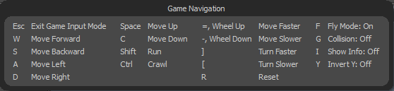 の中にGameレイアウトでは、ゲームナビゲーションを使用して、一連のショートカットキーを使用して、パースビューまたはカメラビューで3Dの世界を移動できます。これは、たとえば、レベルデザインを調べるときに役立ちます。ゲームナビゲーションモードに入ると、マウスカーソルが消え、標準のショートカットキーが無効になります。