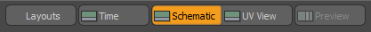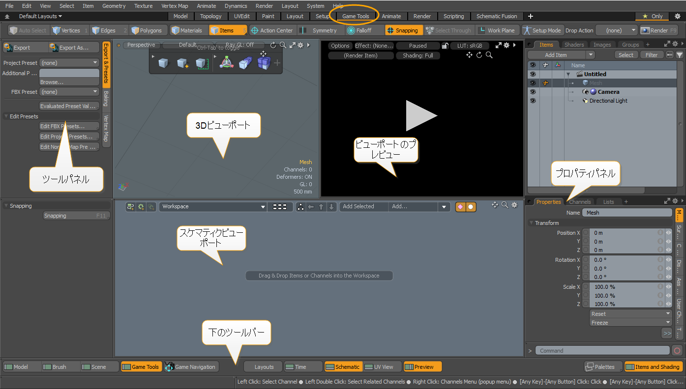 の中心Gameレイアウトはデフォルトで3つの部分に分割されています。3Dビューポート、プレビュービューポート、下部のスケマティックビューポートです。これらのユーティリティビューポートは、ゲームツールパネルと同様に、下部のツールバーのボタンで切り替えることができます。