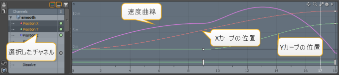 紫色の速度曲線がエディタに表示されます。下の画像は、選択したPosition X そして Position Yチャンネル。
