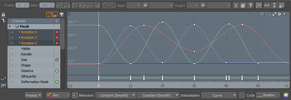 補間は、ユーザー定義のキーフレーム間ですべての値が計算される方法を制御し、すべての値を変更するための便利なショートカットになりますSlopeそしてWeightすべてのキーの値が自動的に。