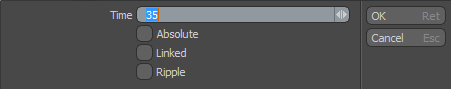 • Time -選択したキーを移動する時間内の位置を決定します。 • Absolute -有効にすると、 Absolute特定の時間を定義できる時間を使用します。無効にすると、時間は現在の時間位置を基準にします。 • Linked -有効な場合Linkedキー(R、G、Bチャネルのキーなど)は、単一のチャネルのみが編集されている場合でも、同じ相対位置でリンクされたままになります。無効にすると、キーを自由に移動できます。 • Ripple -有効にすると、選択した値の以下のすべての値が同じ量だけシフトされます。 |