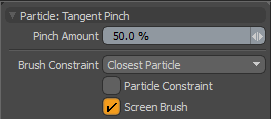 パーティクルツールはPaint下のインターフェースタブParticle Toolsツールボックスのサブタブ。ツールを選択すると、その属性がPropertiesビューポート。ツールを最初に選択すると、 Smooth Brushデフォルトのブラシチップとして。先に進む前に別のブラシチップを選択するか、3Dビューポートで右クリックしてブラシサイズを調整できます。ビューポート内でドラッグして、パーティクルに影響を与えます。Tangent Pinchツールは、ブラシの中心に向かってパーティクルを集めます。のTangent Pinch Amountそれらが動く速度を決定します。押すCtrlパーティクルを外側に(ブラシの中心から離れて)広げることにより、ツールの効果を無効にします。
