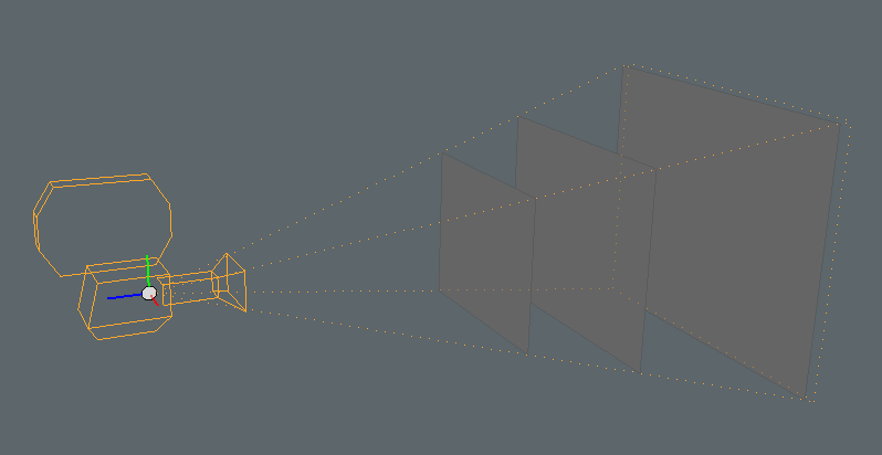 Modoは、特定の深度でカメラから投影された、イメージプレーンに一致するサイズ、位置、回転を備えた長方形のポリゴンを生成できます。これは、カメラの前で画像をレイヤー化し、レイヤー間にジオメトリを挿入する場合に便利です。下の画像は、カメラに追加された3つのイメージプレーンの例を示しています。ポリゴンがカメラの錐台に合うようにスケーリングされていることに注意してください。