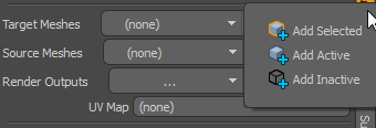 のBakingパネルは完全なセットを提供しますAddそしてRemove選択したベイク項目を操作するボタン。各ボタンは、対応するアイテムタイプがItems ListまたはShader Tree。たとえば、新しいベイクアイテムを追加して、1つまたは複数のメッシュをItems List、 Add次に示すように、ソースまたはターゲットとしてメッシュを追加するためのボタンがアクティブになります。