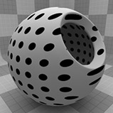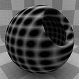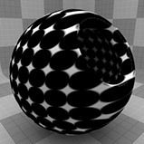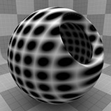 のDotsテクスチャは、メッシュの表面全体に格子状のドットパターンを作成します。ドットのデフォルトは、ハードエッジのあるかなり均一な位置ですが、オプションを変更して、さまざまな配置やソフトランプドットを設定できます。ドットはレンダリング時に手続き的に作成されます。テクスチャには固定解像度がなく、拡大しても詳細な視覚的損失はありません。