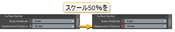スケール値をマテリアルの選択した属性に焼き付けるには、 Apply Scale。これにより、マテリアルの値が変更されます。たとえば、スケーリングDisplacement Distance 50%まで材料の半分Displacement Distance値。
