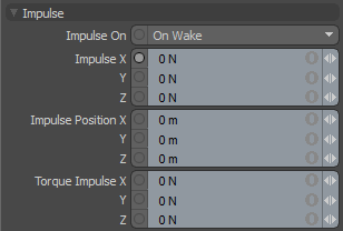 このオプションは、 Impulse動的アイテムに適用される値。 • Off:インパルス値はオブジェクトに適用されません。 • On Wake:インパルス値は、アイテムの起動時に適用されます。 Sleep設定。 • Continuous:インパルス値は、評価のすべてのステップで継続的にオブジェクトに適用されます。 |