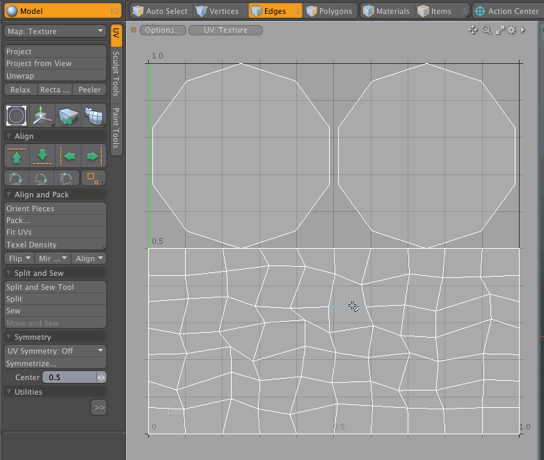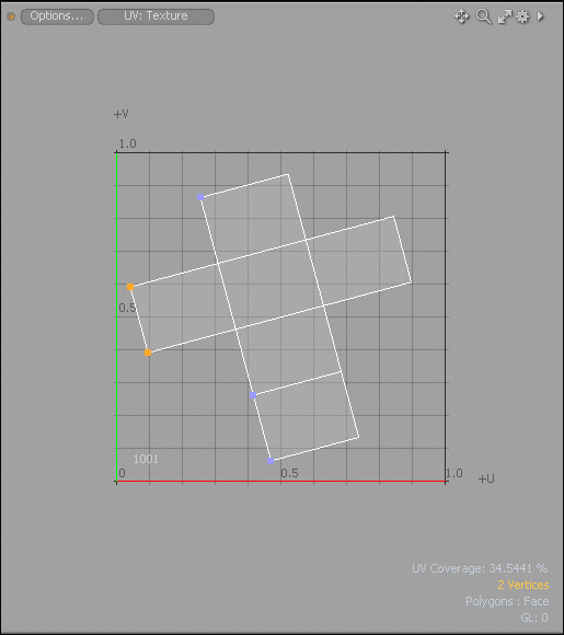 Modoには、頂点またはエッジを選択して適切な回転ツールを選択することにより、UVアイランドを回転できる多数のUV調整ツールが用意されています。UVアイランドを最も近いグリッド軸、水平軸、または垂直軸に揃えることができます。(UVアイランドは、UVマップ内のポリゴンの接続されたグループです。)