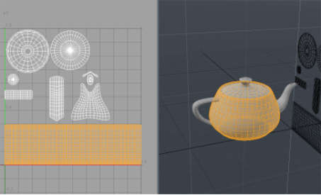 デフォルトのティーポットプリミティブのUVマップ。連続するポリゴンボディが選択され、対応するUVアイランドが表示されます。トポロジが異なることがわかります。