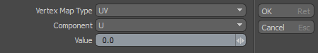 のSet Valueダイアログでは、選択した頂点に対して特定のUV値を定義できます。これは、たとえば、特定のUVセクションエッジに対して頂点の選択を強制する場合などに役立ちます。使用するには、ターゲット頂点を選択してからコマンドを呼び出しますSet Valueメニューから。ダイアログでは、 Vertex Map TypeデフォルトはUVオプション。次に、値が起因するコンポーネントを定義できます- U (水平方向)またはV (垂直方向)。そうしてValue入力ファイルは、グリッドに沿った特定のUV位置を定義します。押すOK値をターゲットに割り当てて、定義された場所に移動します。