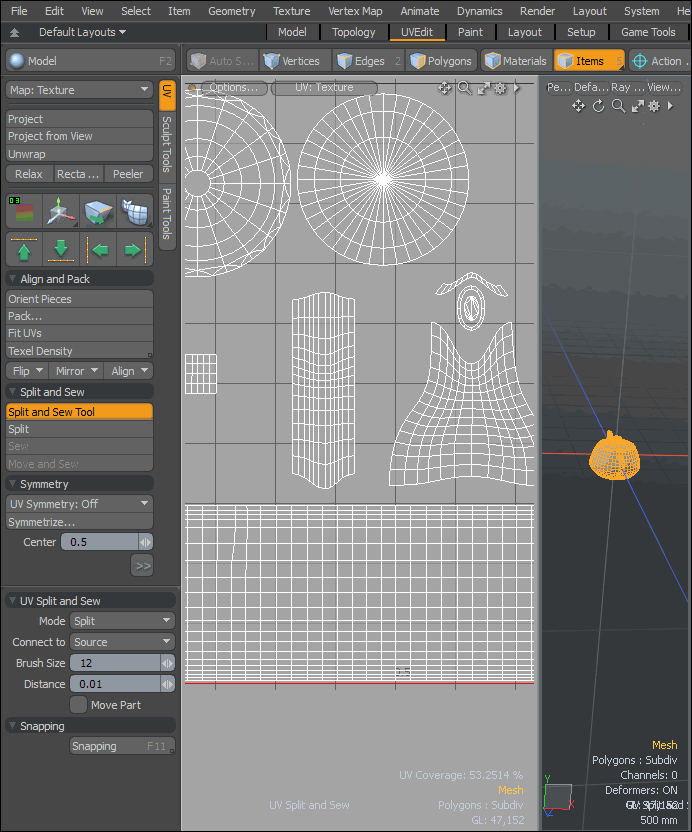のSplit and SewToolマウスをドラッグしてUVのレイアウトを変更できます。このツールはブラシのように機能し、半径で結果を制御します。 モードを設定して、UV空間の頂点にツールを適用するSplit、それらを分離します。ブラシの半径は、開始位置からのオフセットを制御します。開催Shiftキーを押しながらマウスを頂点で右クリックしてドラッグすると、エッジが縫い合わされます。または、モードをSew頂点をクリックすると、エッジが縫い合わされます。