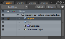 | 4. | の中にItems Lists右側のパネルで、 teapot-uv_relax-example.lxoアイテムと選択Teapot。 |