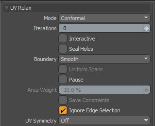 を使用してAdaptive緩和モード、 Area Weightオプションは、変更されたUVアイランドのUV頂点の緩和による変更に抵抗できるように、エリアに適用される重みを決定します。 |