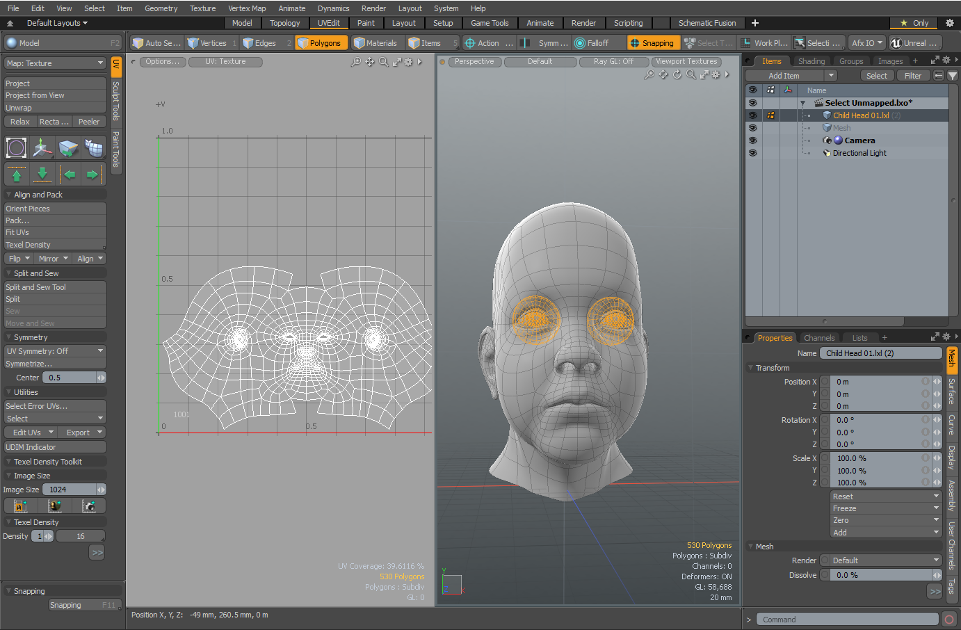 マップされていないポリゴンは、3Dビューポートでハイライト表示されます。これらのポリゴンには、UV座標が割り当てられていません。