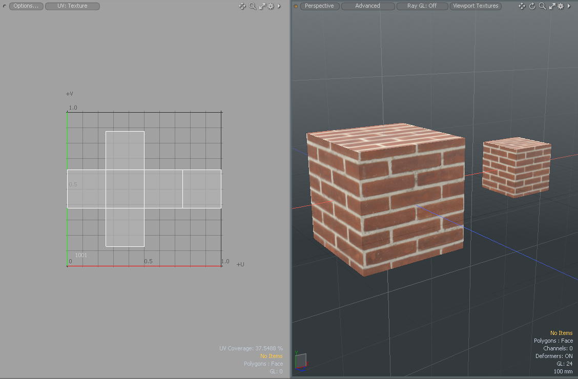 両方のキューブで、テクセル密度はワールドスペースに基づいて平均化されます。たとえば、両方のメッシュアイテムのサイズが考慮され、部分的なレンガ画像が両方のメッシュに適用されます。それぞれ最上段に5つのレンガがありますが、レンガのサイズは両方のメッシュで異なります。![]()