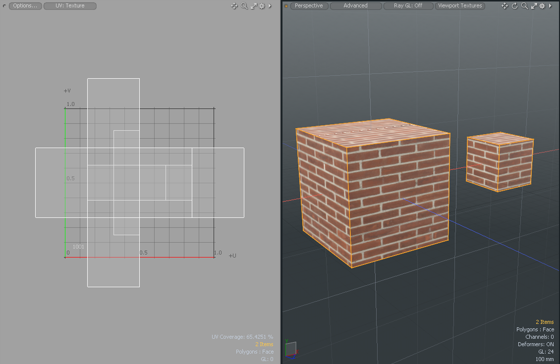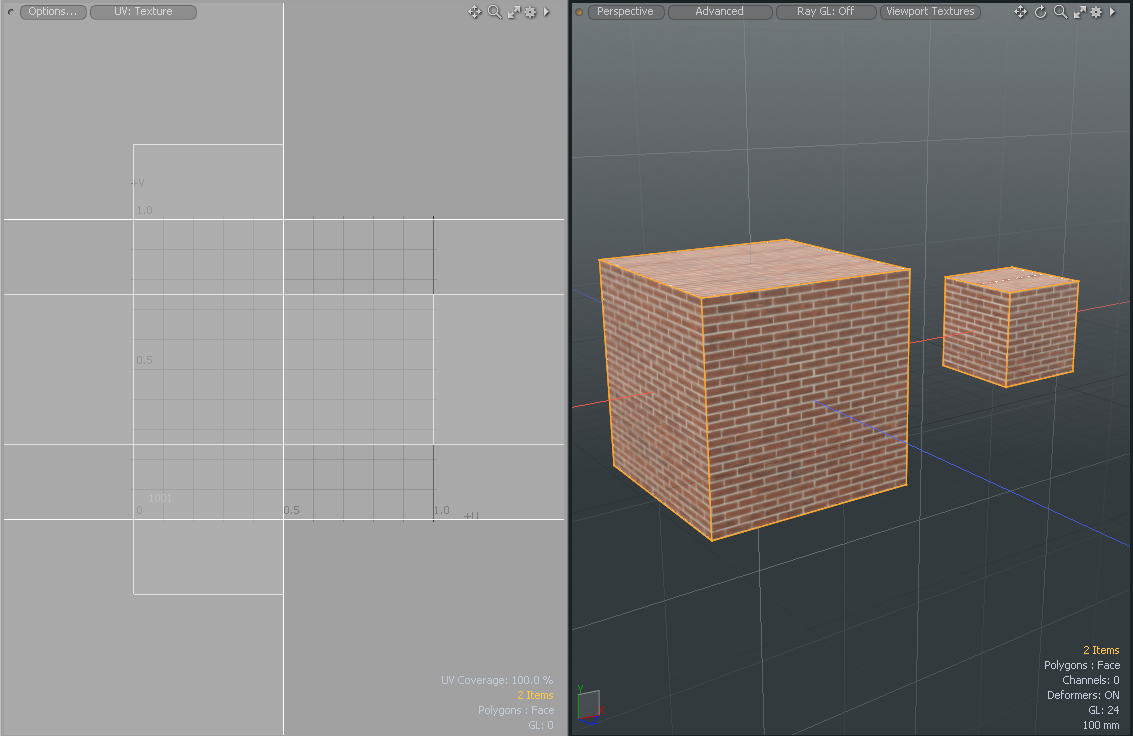 ヒント: 使用する場合texel-density-apply-overall_bundled.lxoシーン例、および上記の手順に従って適用するApply Overall、両方のメッシュのUVが更新され、同じテクスチャサイズが表示されます。