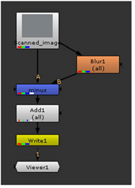 | 5. | 選択するMerge > Mergeスクリプトにマージノードを挿入します。MergeノードのA入力を元の画像に接続し、B入力をぼかしノードに接続します。次に、マージコントロールを開き、選択しますminusからoperationドロップダウンメニュー。ぼやけた画像は元の画像から差し引かれます。 |