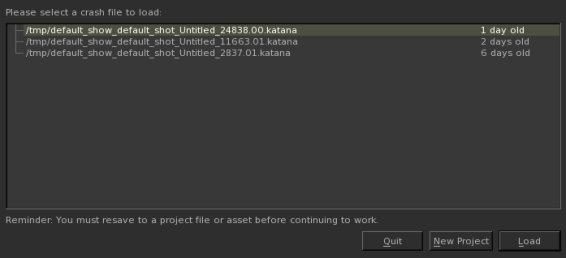 To load an autosave file, launch Katana using the --crash command-line option, this opens the Katana Crashfile Selector dialog.