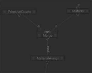 The contents of a group that holds PrimitiveCreate, Material, Merge, and MaterialAssign nodes, with a connection leaving the group from the MaterialAssign node. |