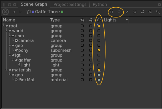The Scene Graph tab allows you to select which lights or materials you wish to Live Render with the Live Render Updates