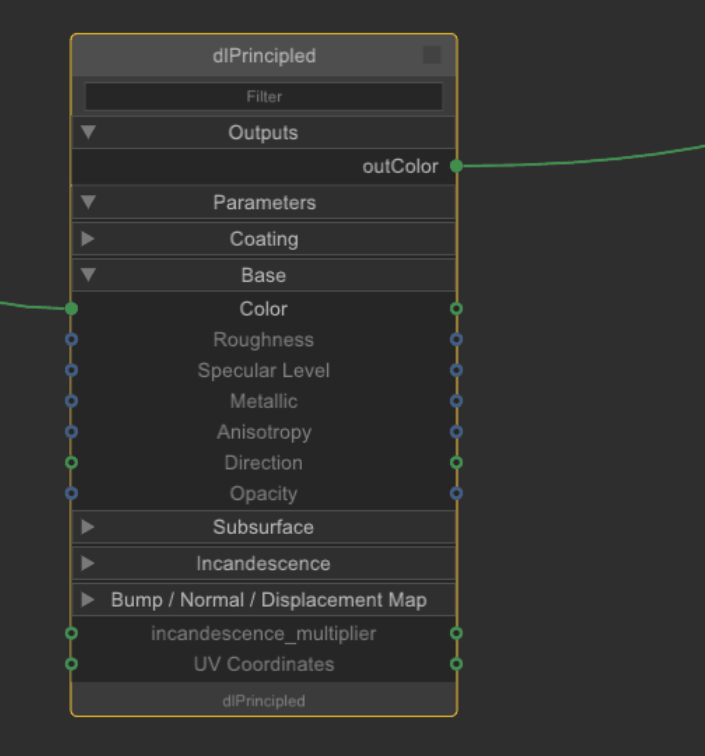 Tip: In the same way as the terminal sidebar, you can type in the Filter field of the shading nodes to quickly search for an input/output, even if the menu is not expanded.