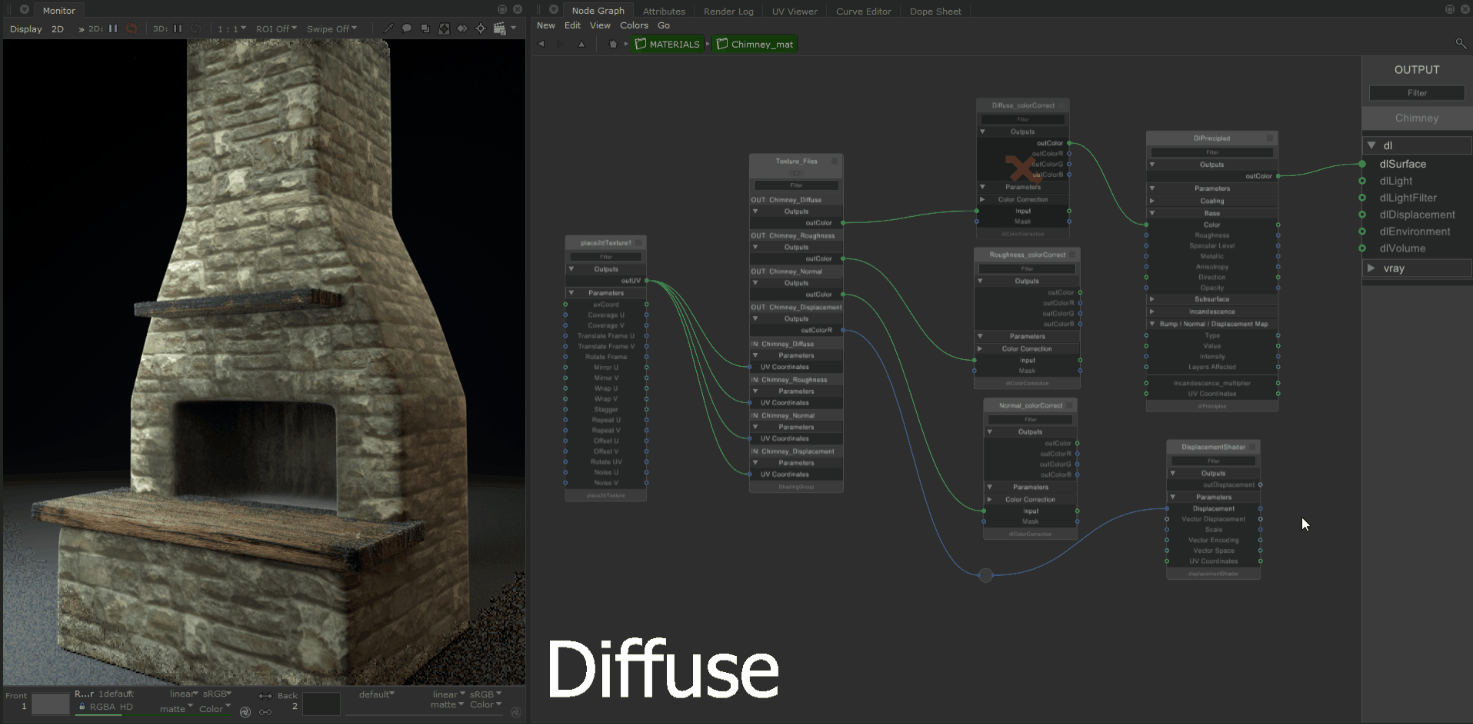 Setting up shading nodes within the NetworkMaterialCreate node is designed to make things as simple as possible for artists. Shader networks set up inside the group feature a left-to-right workflow which is well suited to working with a large number of shading nodes.