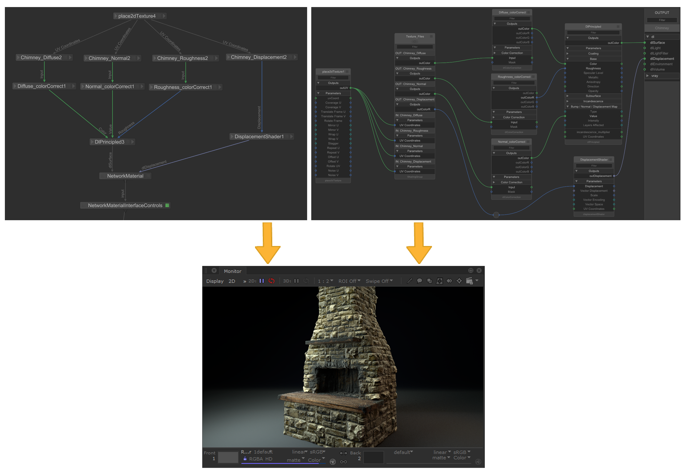 | Workflow example for connecting shading nodes, and their effect |