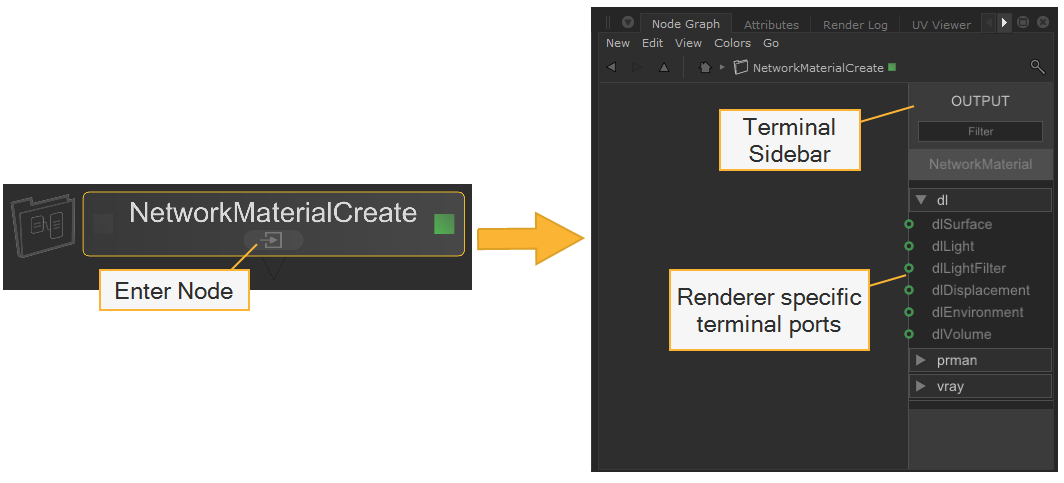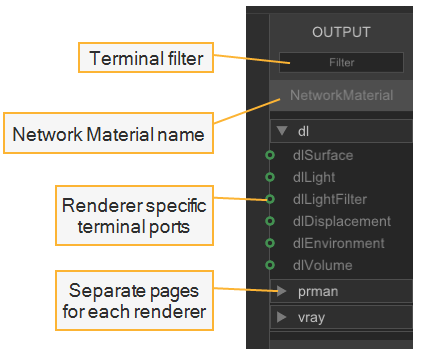 Inside the NetworkMaterialCreate node is a fixed sidebar on the right, which shows the terminals for each renderer you have set up with Katana. This sidebar functions in the same way as the Network Material node in the previous workflow, but all the terminals are prepopulated so the user doesn’t need to add them manually.