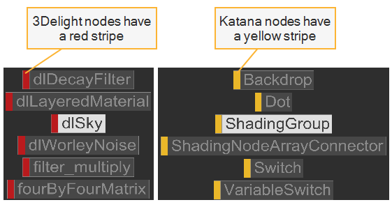 The nodes have a colored stripe on the left to indicate whether they belong to a renderer or whether they are standard Katana nodes. For example, the 3Delight shading nodes are color-coded with a red stripe and the Katana nodes appear yellow.